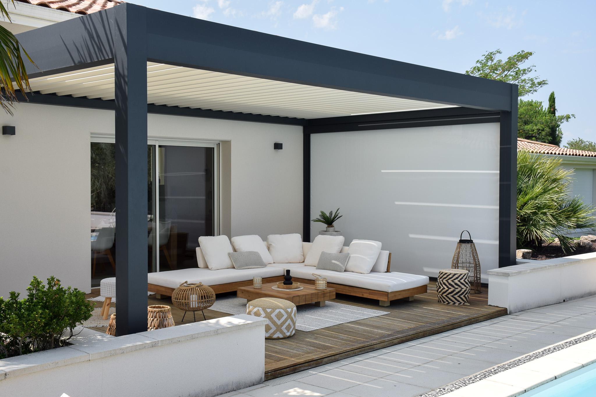 The roof is made of aluminum louvers that rotate up to 90°, so you can fine-tune light and airflow instead of choosing “open” or “closed.” Open them for full sun. Tilt them to cut glare while still getting a breeze. Close them to create a solid overhead cover. The angle control also helps with low morning or late afternoon sun when glare is the worst.